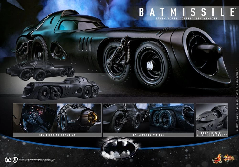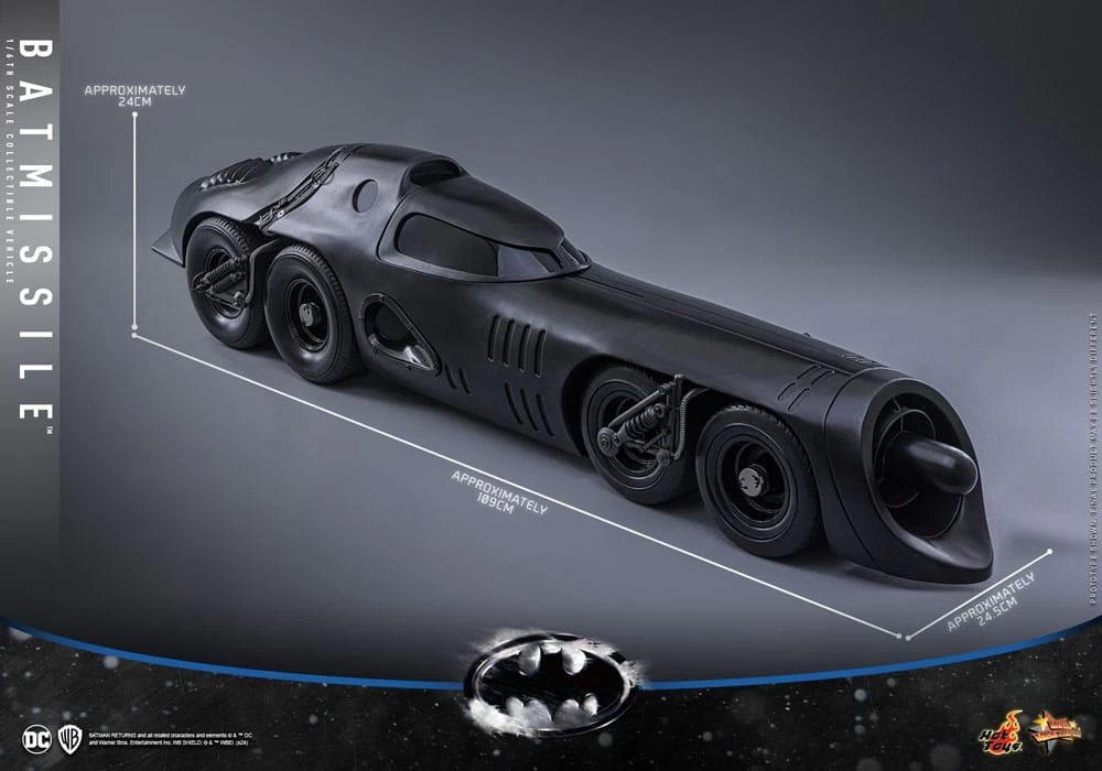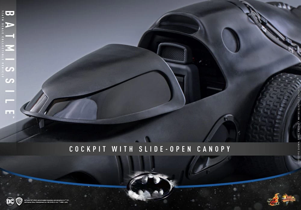 Aus Hot Toys´ luxuriöser ´Movie Masterpiece´-Reihe kommt diese grossartige Nachbildung der Batmissile aus „Batmans Rückkehr“, passend zu den Batman 1/6 Figuren von Hot Toys. Das Modell verfügt über LED-Leuchtfunktionen, eine aufschiebbare Cockpitabdeckung und echte Gummireifen. Größe: 24 x 24 x 109 cm Keine Figuren enthalten.