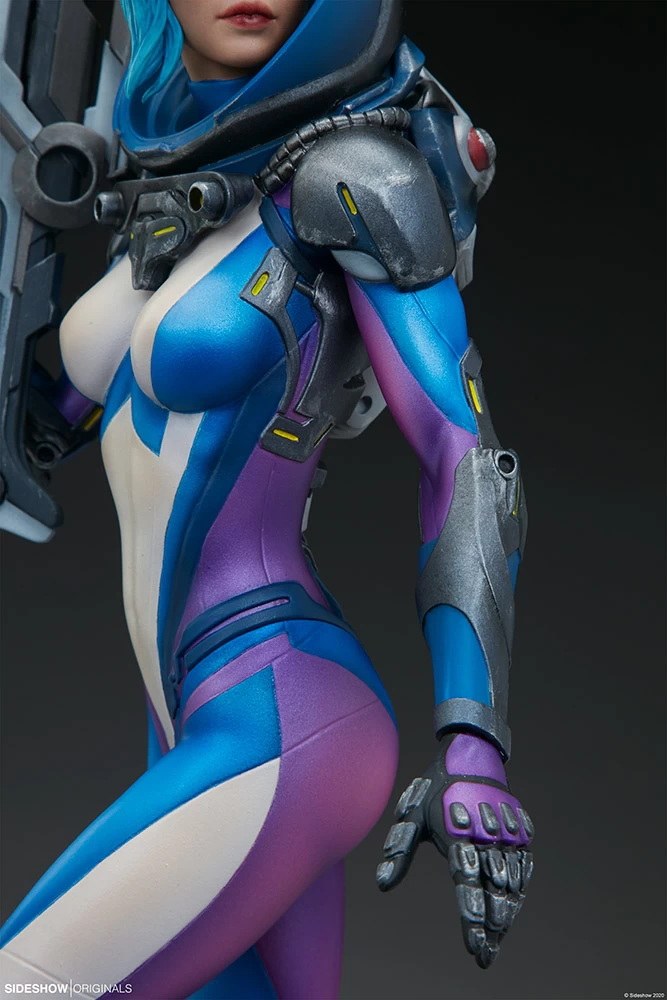 The Bounty Hunter: Galactic Gun for Hire Statue ist über 48 cm groß und steht nach einer kunstvollen Bruchlandung auf einem feindlichen außerirdischen Planeten aus ihrem Raumschiff. Ein Teil der einheimischen Fauna nimmt das Eindringen nicht gut auf und greift mit Krallententakeln nach ihr. Unbeeindruckt überblickt die furchtlose Trackerin die Landschaft, um ihr Ziel zu sichten. Sie ist mit ihrem zuverlässigen Blaster bewaffnet und einem hochmodernen Raumanzug bekleidet.