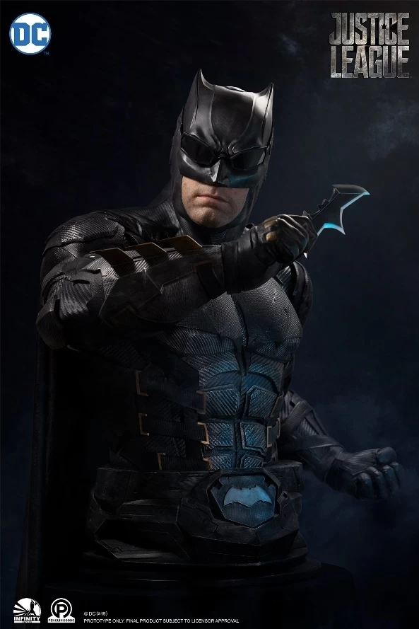 Authorized by Warner Bros, 95 cm in height, crafted based on the Ben Affleck’s Batman appearance. It features medical grade silicon to create the likeness of the face and it also includes punched facial hair. The bust showcases the Batman Tactical Batsuit posed holding a batarang, signaling that the batarang is ready to be thrown. In addition, interchangeable eye pieces are also included. Limited to 600 Pieces Worldwide.