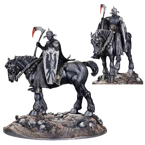 The original Death Dealer painting, by Frank Frazetta, comes to life in magnificent detail. Seated atop his intimidating steed and holding his bloodied weapon, he overlooks the ash and bones of the fallen. Complete with actual metal chain and hand-painted details, this finely detailed resin statue stands 8-inch tall and the base is approximately 8-inches wide. An excellent addition to any Frazetta collection, or for any fan of the dark and otherworldly.