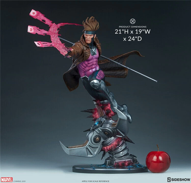 The Gambit Maquette measures 21 tall as the ragin Cajun charges into battle over a giant mechanical claw emerging from the Danger Room base. Purple bursts of kinetic energy explode out of the weapon as Remy LeBeau leaps to the aid of his fellow X-Men, clutching his bo staff and flinging several charged-up playing cards into the fray.