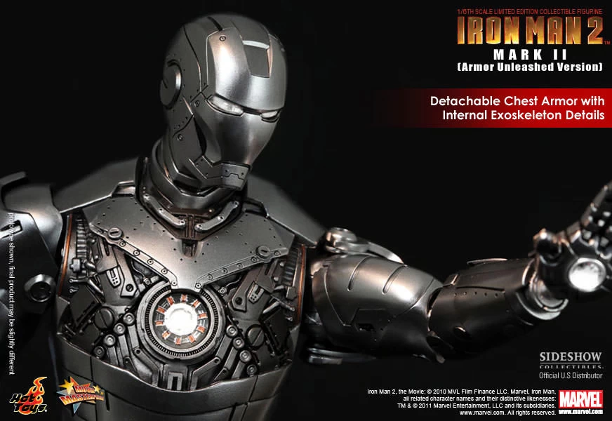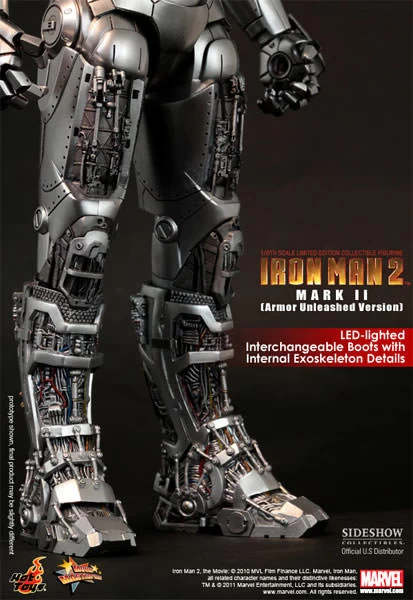 Sideshow Collectibles and Hot Toys are again proud to present collectible figures from the Iron Man 2 movie – the Iron Man Mark II – Armor Unleashed Version 12-inch Figure! The movie-accurate Mark II collectible is highly detailed and deployed, specially crafted based on the image of Don Cheadle as Mark II in the movie, highlighting the authentic head sculpt, as well as the detachable chest, biceps, thighs armors and LED-lighted interchangeable boots with internal exoskeleton details.