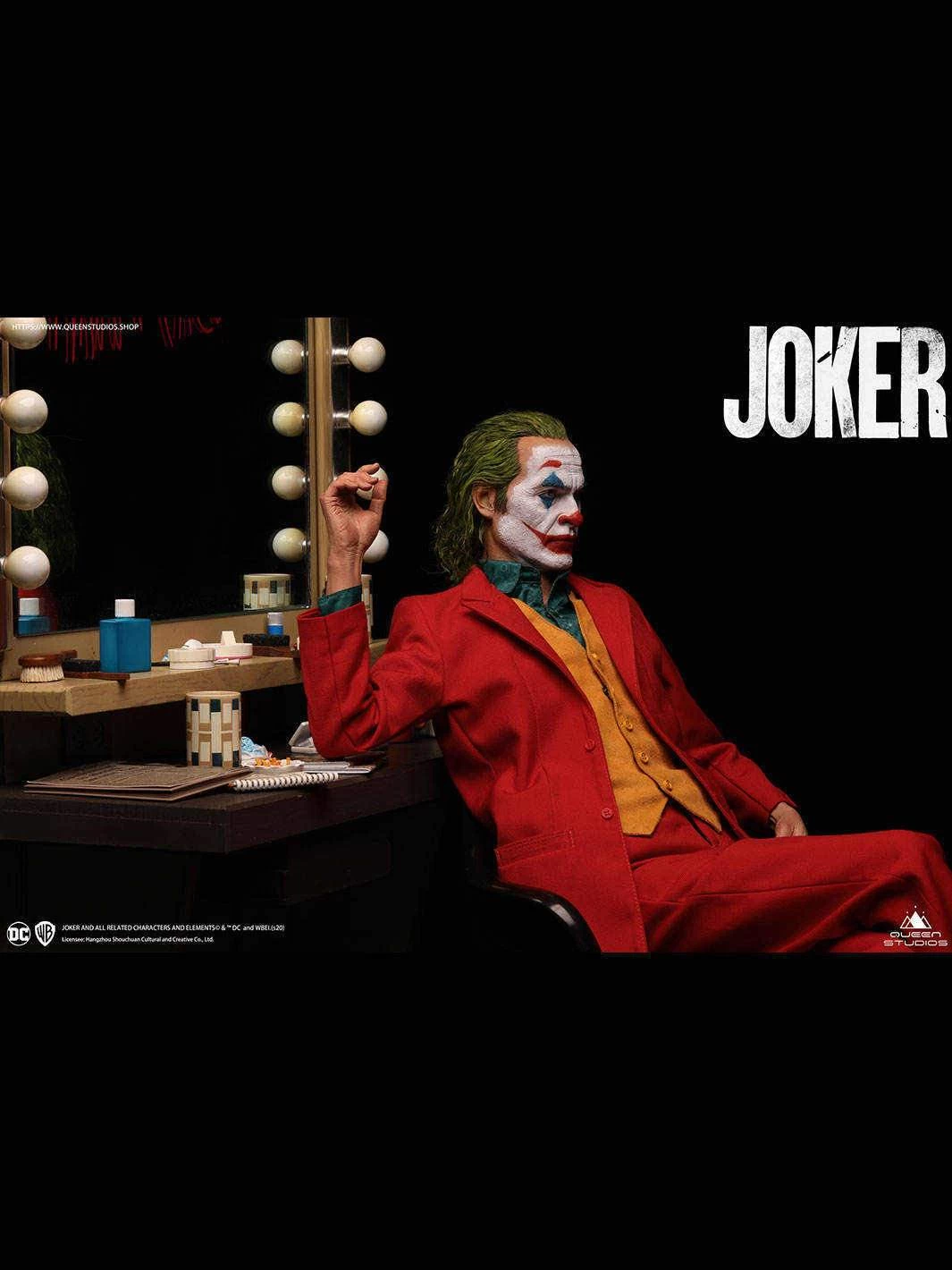 The Queen Studios team has carefully recreated one of the most iconic scenes from the 2019 Joker movie. As Arthur sits in his chair deep in thought, his legs crossed, one arm raised, who knows what twisted thoughts are running through his mind? No detail is spared, from his tailored clothing, to the bar of soap and brush on his dressing room table, and those immortal words inscribed on the mirror, Put on a HAPPY FACE .