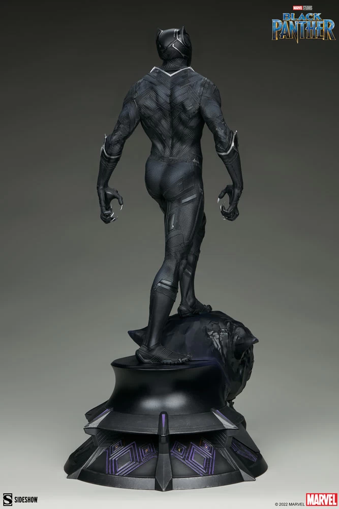 The polystone Black Panther 1:4 Scale Statue is fully sculpted to capture the iconic look of the character s on-screen appearance in the Marvel Cinematic Universe. T Challa s suit features both matte and glossy black paint applications as well as Vibranium silver accents to emphasize the detailed textures. The sleek Wakandan design highlights the king s muscled physique, and this Marvel statue comes with two distinct portraits – his signature Black Panther mask and an unmasked head. Choose how the Black Panther will meet your Marvel collection with these alternate display options.