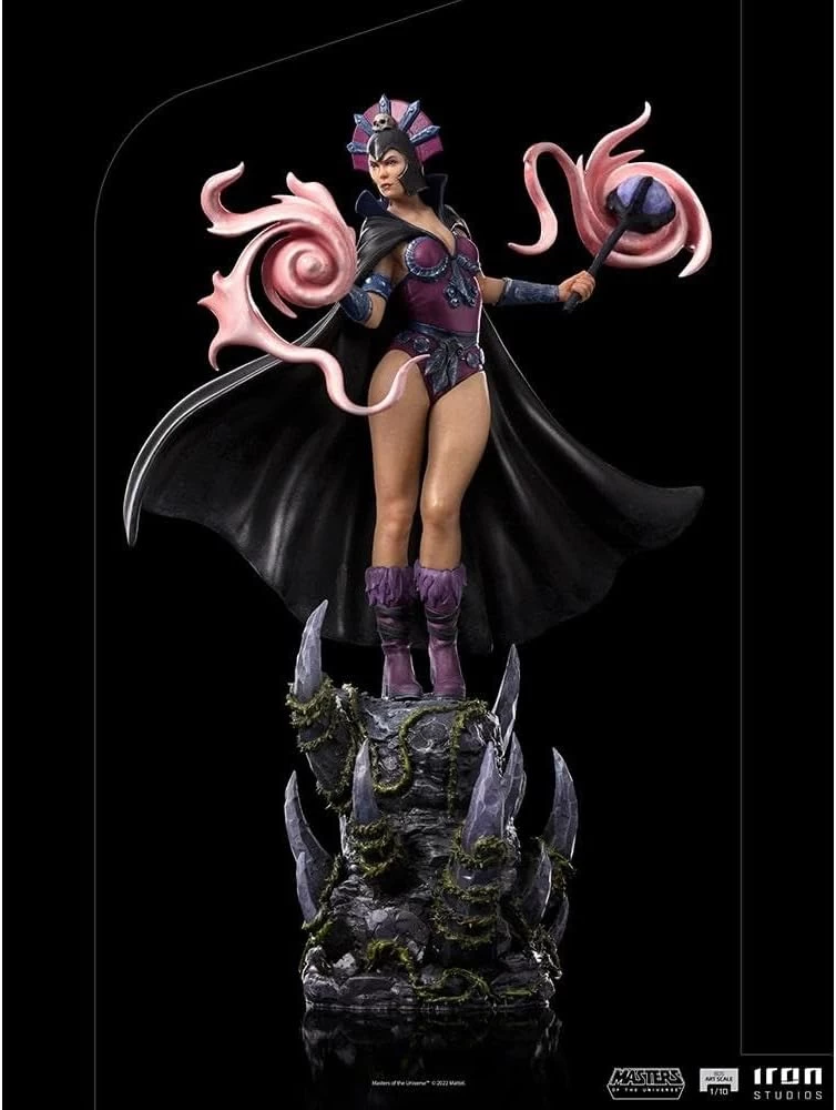 , Evil-Lyn keeps loyally serving Skeletor as his second-in-command, but always hinted that one day she would usurp his position. traditional clothes in the shape of a purple swimsuit with blue ornaments, violet boots with black ribbons, blue bracelets, and having her body covered by a black cape and her head protected by a black helmet with a crown in her suit’s colors, Iron Studios present the statue “Evil-Lyn BDS – Masters of the Universe – Art Scale 1/10”, the most feared enemy villainess of He-Man and the Masters of the Universe, on a pedestal that refers to the evil lair on Snake Mountain.