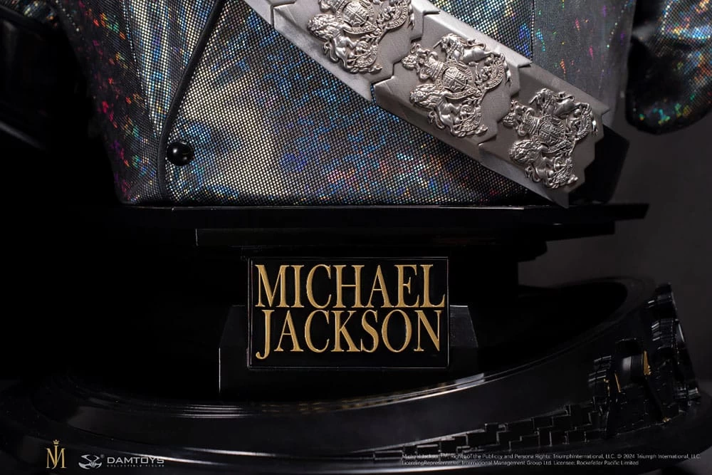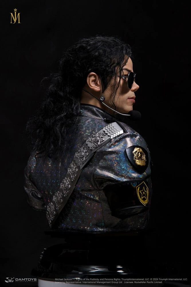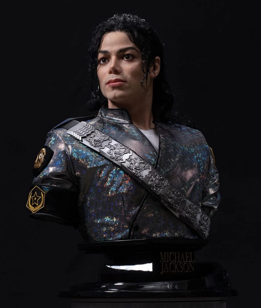 Sideshow und Damtoys präsentieren die Michael Jackson (Dangerous Tour) Life-Size Büste. DAMTOYS Jährliche Neuerscheinung: Michael Jackson Hyper-Realistic Celebrity Portrait 1/1 Sculpture – Eine zeitlose Hommage an eine Ikone. Das Produkt wurde von der Kleidung inspiriert, die Michael Jackson zu Beginn seiner Dangerous Tour in Bukarest, Rumänien, trug.