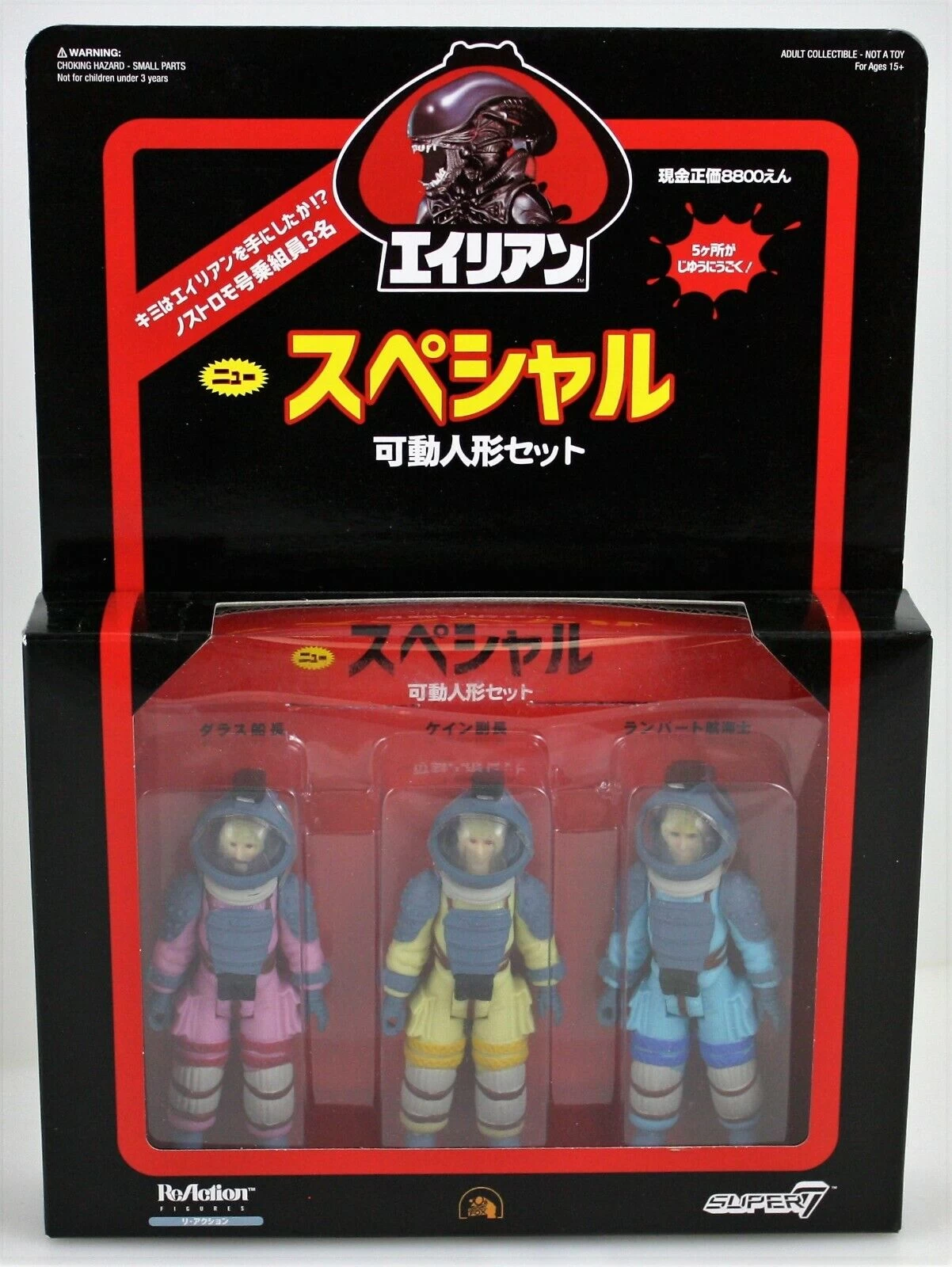 Alien Nostromo 3-Pack with Kane, Lambert, and Dallas in Nostromo Space Suits. The doomed trio are packaged in a new, exclusive black Japanese window box!