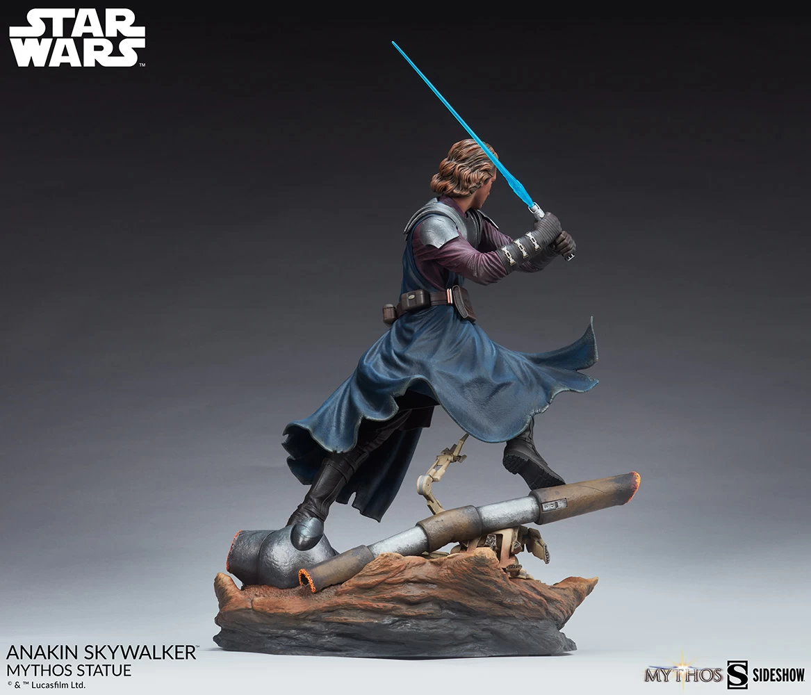 The Anakin Skywalker Mythos Statue measures 21 tall as the Jedi Knight cuts through an infantry of B1 and B2 battle droids during the Clone Wars conflict. Wielding his blue lightsaber blade, Anakin is a fierce and often overconfident fighter, but is nonetheless a peacekeeper aligned with the noble goals of the Jedi Order.