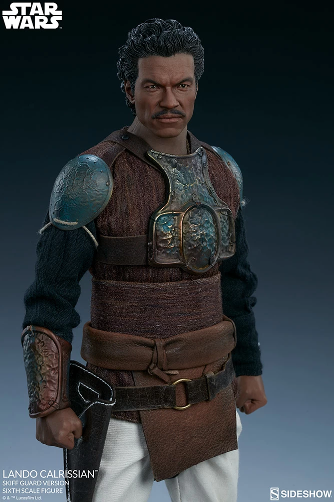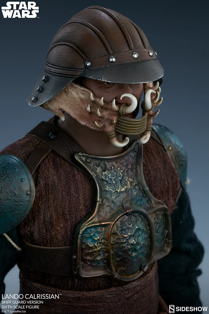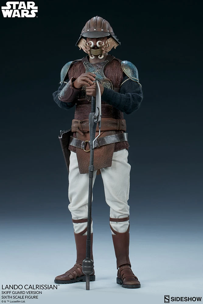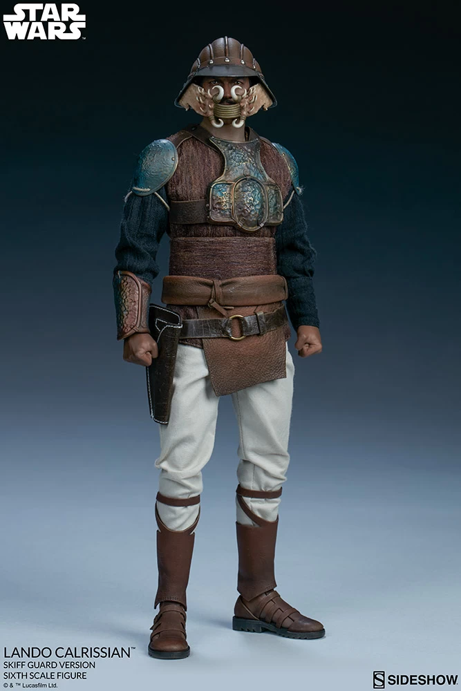 The Lando Calrissian Skiff Guard Version Sixth Scale Figure captures the Bespin baron s distinct disguised look from Star Wars: Episode VI- Return of the Jedi, as he accompanies the infiltration mission to Jabba the Hutt s palace on Tatooine. The figure includes both an unhelmeted portrait with the detailed likeness of actor Billy Dee Williams and analternate portrait with a non-removable helmet and mask as a part of his full guard uniform.