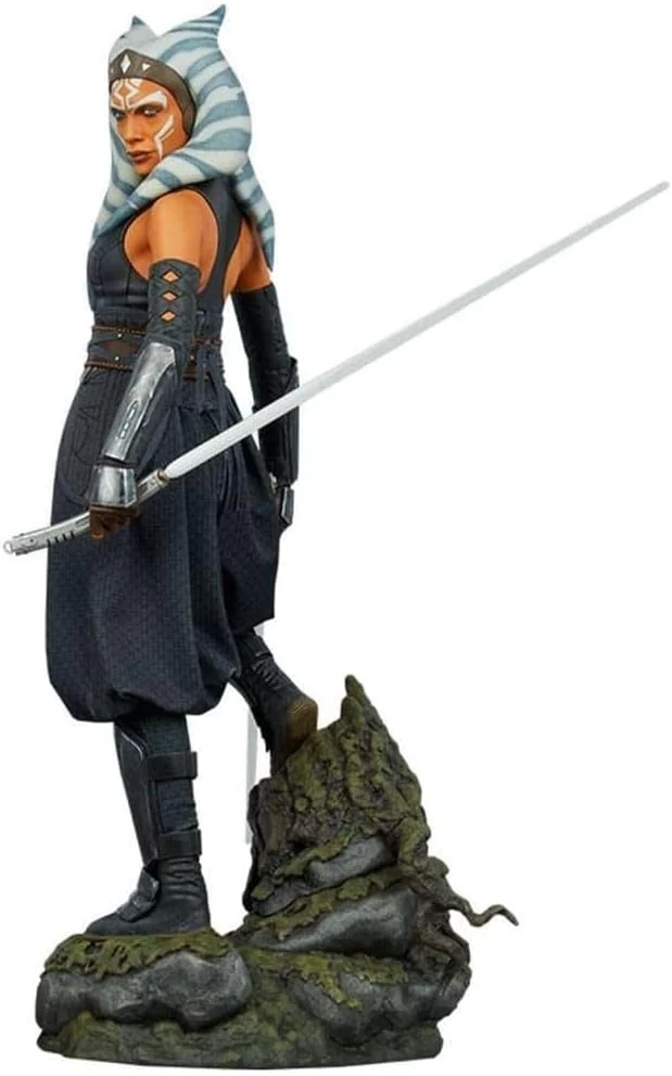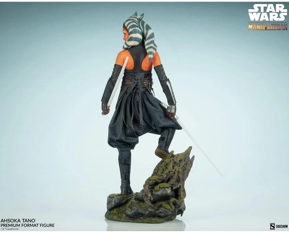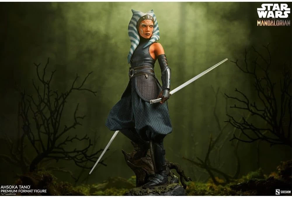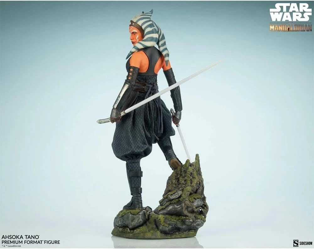Die Ahsoka Tano Premium Format Figur ist 47,6 cm groß und schwingt ihre zwei weißen Lichtschwerter, während sie auf einer Environment-Base steht, die vom Waldplaneten Corvus inspiriert ist.