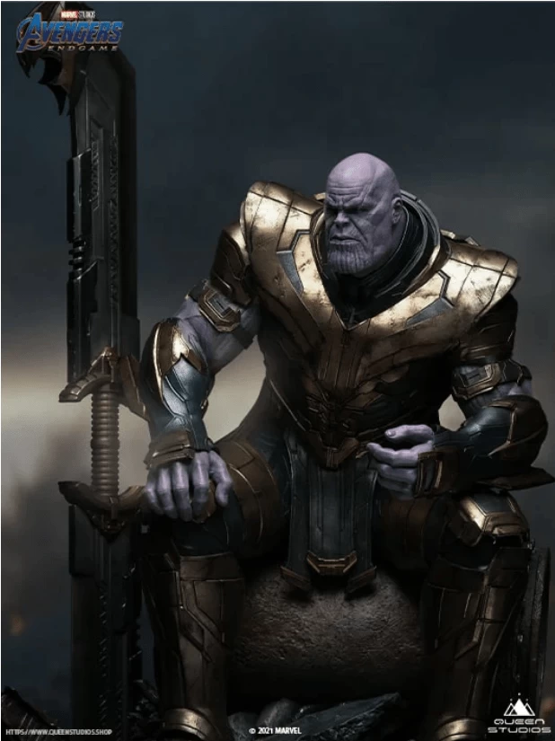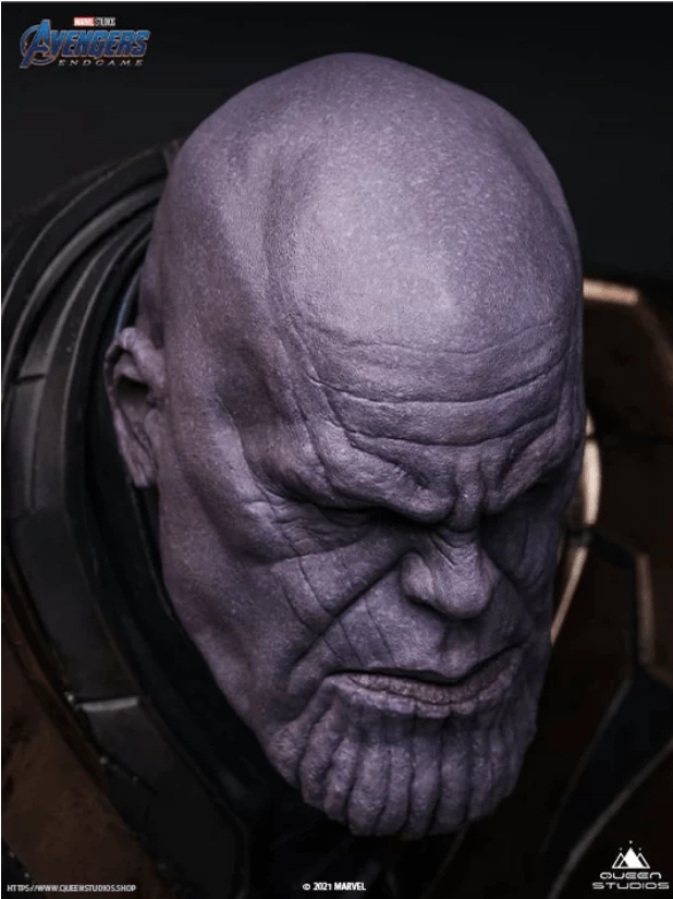 The Queen Studios 1/4 Thanos statue is based on the Thanos we saw in Avengers Endgame. Expertly crafted and intricately detailed, this limited edition collectible features two head sculpts inspired by the 2019 hit movie. The first head sculpt features Thanos looking deep in thought with a serious expression. While the second head sculpt features the Mad Titan with a wry smile
