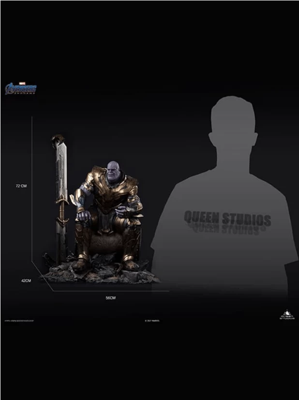 This limited edition collectible Thanos statue depicts the demigod as he sits waiting for the Avengers. The whole scene is masterfully recreated sparing no detail. The Mad Titan is wearing his golden armour, with his double edge sword standing beside him, and his helmet resting on top. Both the base and body fit perfectly with the two head sculpts making this statue a must have for the discerning collector!