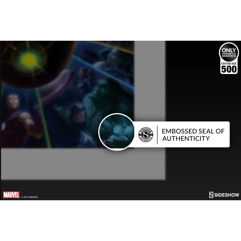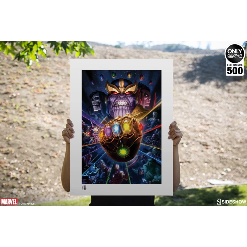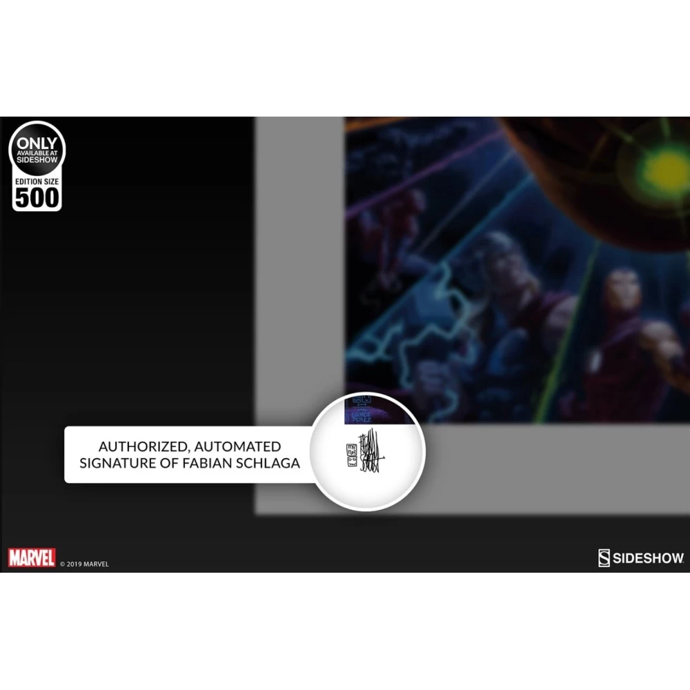 The Thanos & Infinity Gauntlet Fine Art Print by Fabian Schlaga features an authorized, automated artist signature and an embossed Seal of Authenticity as a part of the limited edition of 500 pieces. This fine art collectible is a must-have for Marvel fans of every generation!