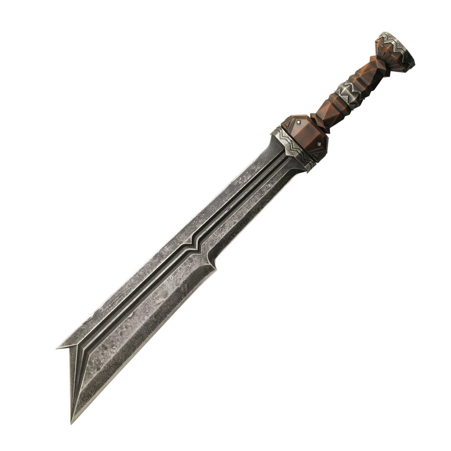 This authentically detailed replica is a reproduction of the actual filming prop built by Weta Workshop of New Zealand and used in the motion picture, THE HOBBIT: AN UNEXPECTED JOURNEY. United Cutlery, industry leader in fine movie reproductions, has meticulously recreated the prop using only the finest grade materials and craftsmanship. Close attention to detail was a top priority. The Sword of Fili is 25 1/2 inch overall, featuring a massive 3/8 inch thick stainless steel blade, and a hilt of solid metal and hard acrylic. It is presented with a wood wall display and includes a certificate of authenticity.