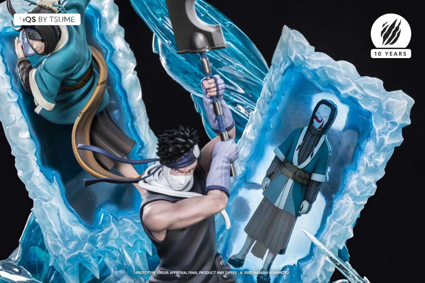 This HQS statue of Zabuza and Haku pays a poignant tribute to the powerful bond that unites them. By reaching out to him and making him his unstoppable weapon, Zabuza offers the orphan the opportunity to be useful to someone, becoming from that day his only reason for living. While the two inseparable ninjas advance side by side, they also benefit from the same fighting ability: they master the force of water. Thus, we see in the foreground the Demon of the Hidden Mist, brandishing above his head his gigantic legendary sword Kubikirib ch , renowned as the Seversword, in order to carry out its task. The rogue ninja wears his black outfit, his striped Kirigakure leg-warmers, his forehead band to the side, and although the lower part of his face is covered with bandages, these cannot mask his ruthless expression. Devoid of any mercy, he uses the Water Dragon Bullet Technique to swallow his prey. Protecting his rear and offering him total obedience, the descendant of the Yuki clan, is more than ready to defend the only person who matters to him, whatever the cost With one hand, we see the shinobi withdraw his hunter-nin mask revealing his real face, on the other hand, prepare his fatal attack! Endowed with a kekkei genkai: Ice Release, like his late mother, the orphan of the Land of Water causes the Demonic Mirroring Ice Crystals to appear. Very quickly, we see him insert his right leg, ready to trap his target and assail him from all sides with countless bloody throws of senbons. In an offensive posture, wearing his green and brown kimono, his obi thrown back, and his headband with Kirigakure symbol on his forehead, his gentle face in no way deceives his emotions, he will immediately bring down anyone who tries to reach Zabuza. Indebted to him and not fearing any enemy, nor even death itself, he will protect until the end the one who gave meaning to his life.