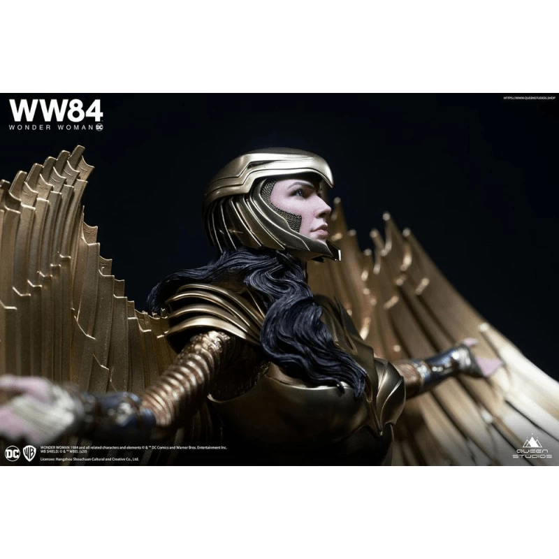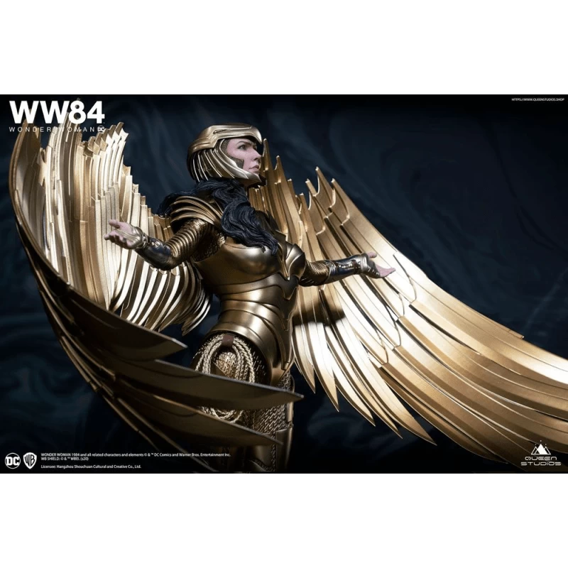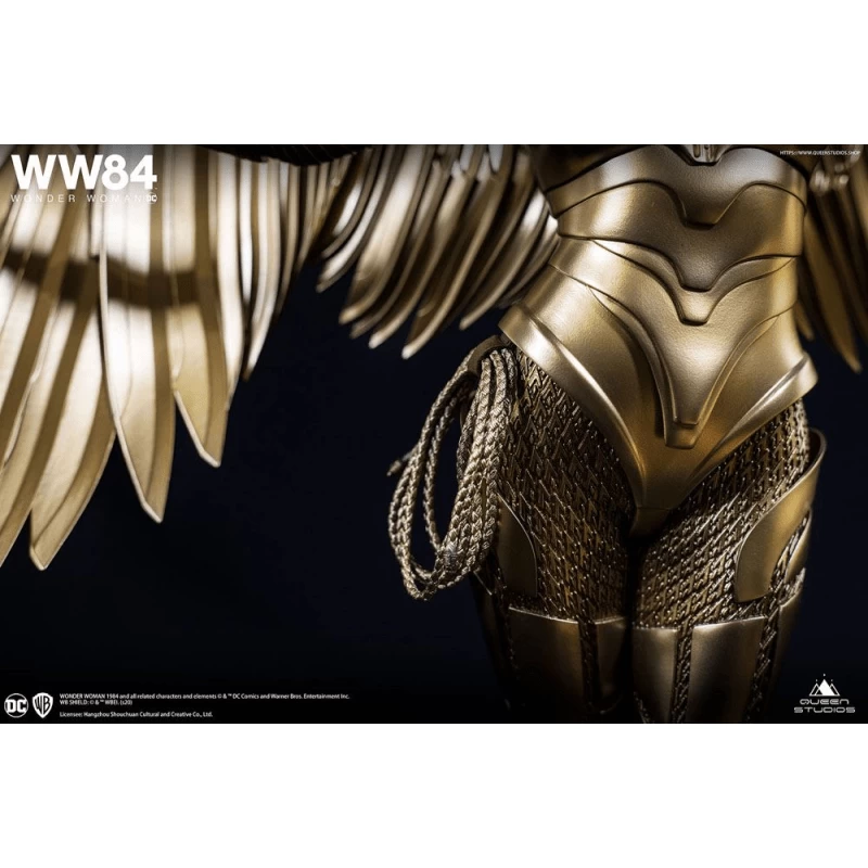 The pose the Queen Studios team have chosen shows Wonder Woman with her arms open wide and her golden wings spread majestically behind. As she looks up, she is majesty and power personified. The striking statue is accentuated further with incredible detailing throughout. No detail is spared as the finish on the paint creates a next level of realism as she stands atop a golden base.